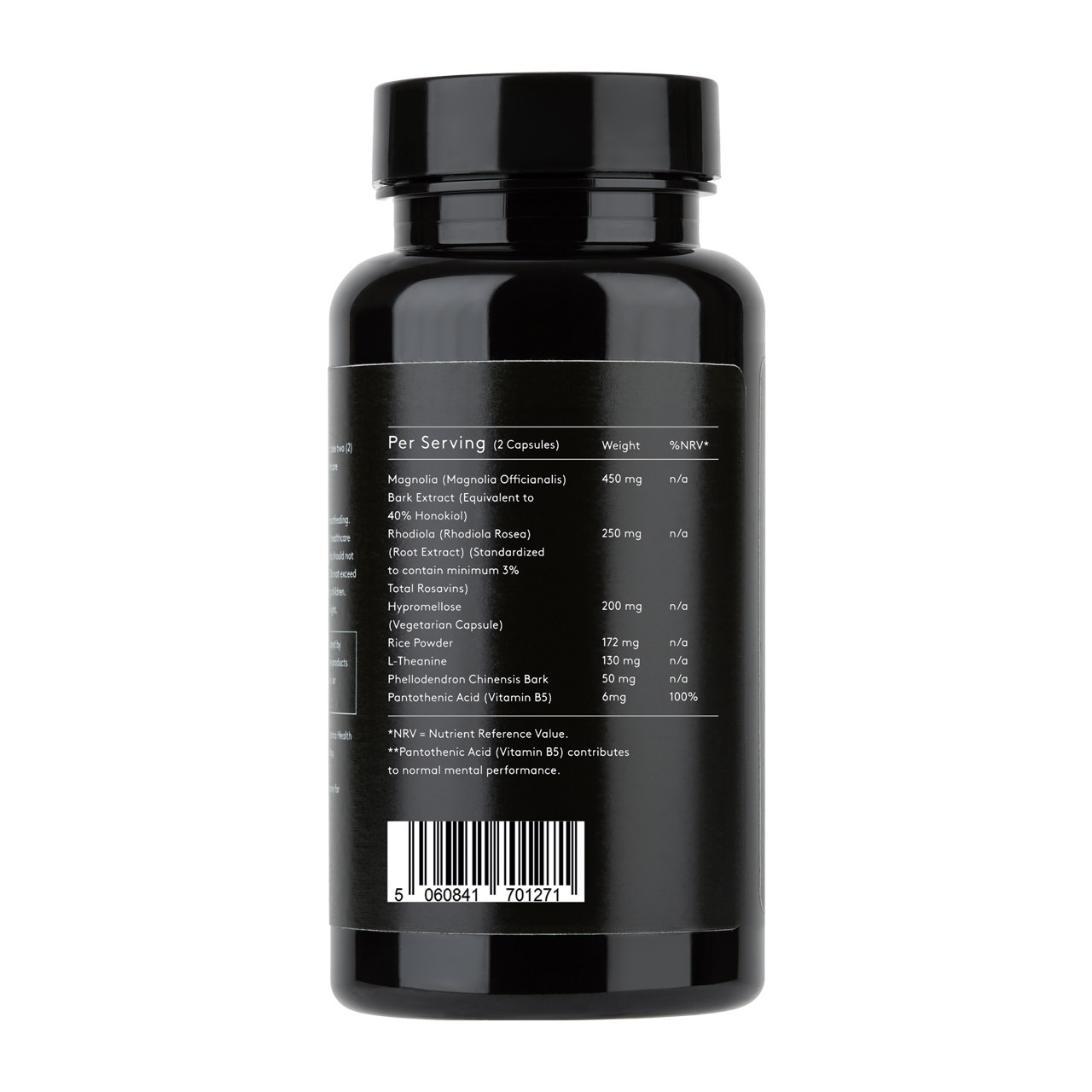 Magnolia Bark Extract (40% Honokiol), Rhodiola Root Extract (standardised to 3% total rosavins), L-theanine, Rice Powder, Phellodendron Chinensis Bark, Pantothenic Acid (Vitamin B5), Hypromelliose (vegetarian capsule shell).