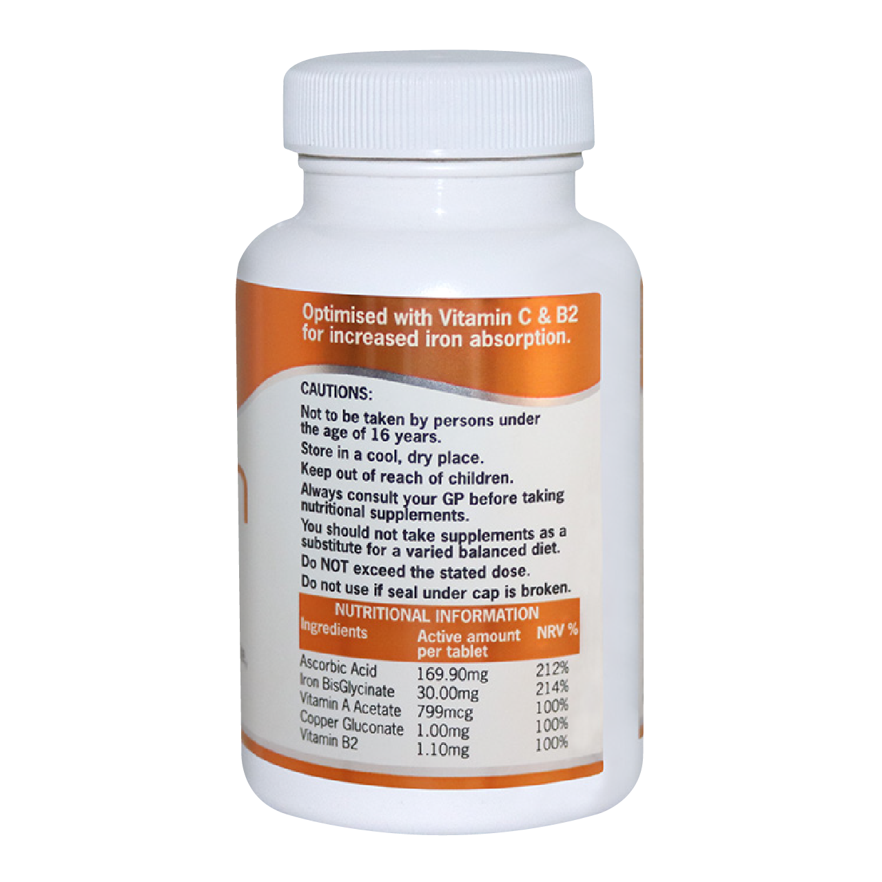 Ascorbic Acid DC, Iron (Ferrous) BisGlycinate, Microcrystalline Cellulose (MCC), Dicalcium Phosphate, Vitamin A Acetate, Copper Gluconate, Magnesium Stearate, Silicon Dioxide and Vitamin B2 (Riboflavin).