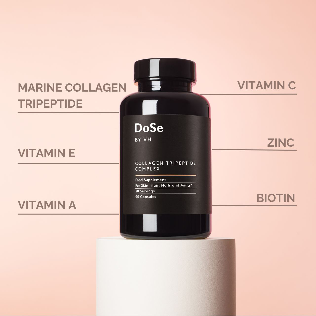 Collagen Tripeptide Complex capsules by DoSe is an expertly formulated superior collagen supplement with science backed nutrients including Vitamin C, Zinc, and Biotin, to naturally boost collagen levels and support the health of your skin, hair, nails and joints.