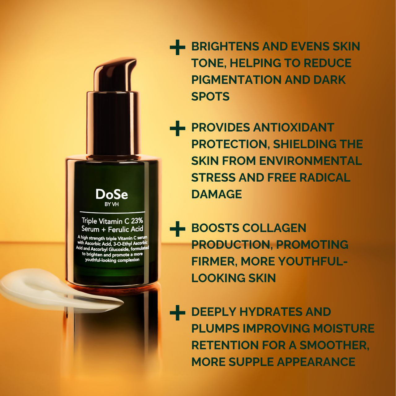 This Vitamin C + Ferulic Acid Serum is fast absorbing, non-sticky, high strength vitamin C serum for face helping to reduce the appearance of age spots and dark spots leaving skin with an even tone. DoSe Vitamin C serum contains three forms of Vitamin C: L-Ascorbic Acid, 3-O-Ethyl Ascorbic Acid and Ascorbyl Glucoside, that brighten, improve uneven skin tone, boost collagen production, and hydrate for a firmer, smoother, and more youthful-looking complexion. DoSe Triple Vitamin C serum is enhanced with Ferulic Acid, a powerful antioxidant that boosts the stability and effectiveness of Vitamin C, this brightening serum also provides superior protection against environmental stress to help protect against premature ageing.