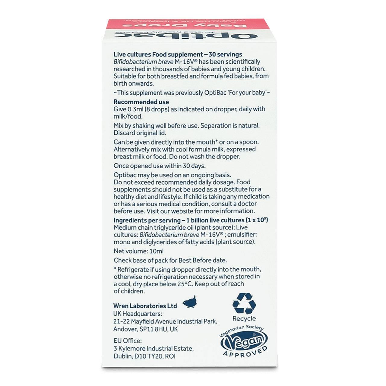 Directions: As a food supplement, baby Drops can be given to infants from birth to 3 years old, with the following recommendations. For best results give 0.3ml (8 drops) daily. 8 drops contain a minimum of 1 billion live Bifidobacterium breve M-16V®. Do not exceed the recommended daily dosage. Shake the bottle well before each use - separation is natural. Discard the original lid. Administer in any of the following ways: Directly into the mouth+, on a spoon, in a bottle of formula milk or expressed breast milk, on a clean finger (one drop at a time), on the nipple (a drop or two at a time). For older children, mix the drops into cool food or drinks. Can be given at the same time as medications for colic relief. Do not wash the dropper.