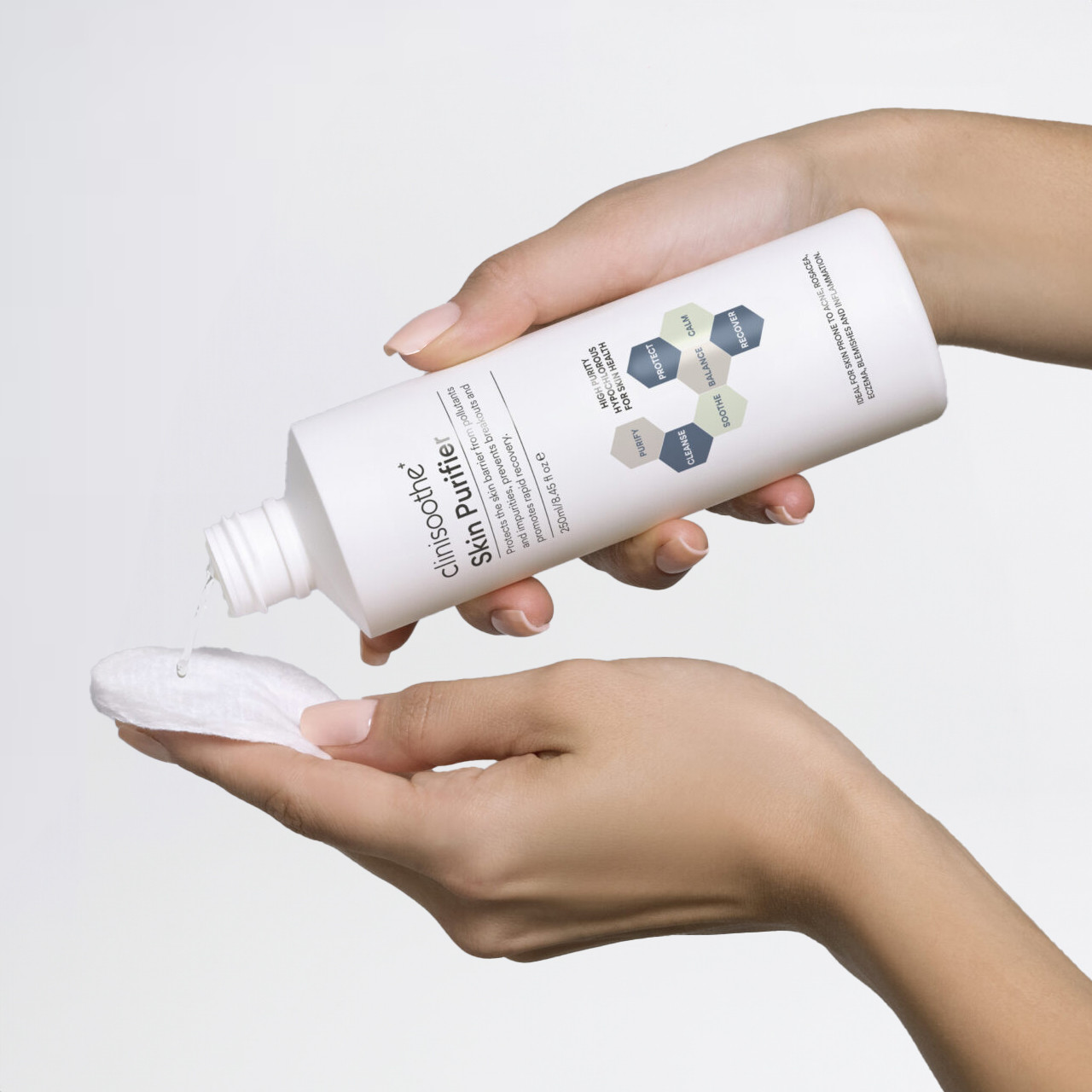 Clinisoothe+ Skin Purifier, 250ml, provides 7 benefits; it purifies, cleanses, soothes, balances, protects, recovers and calms skin that’s prone to eczema, psoriasis, dermatitis, rosacea, acne and spots.