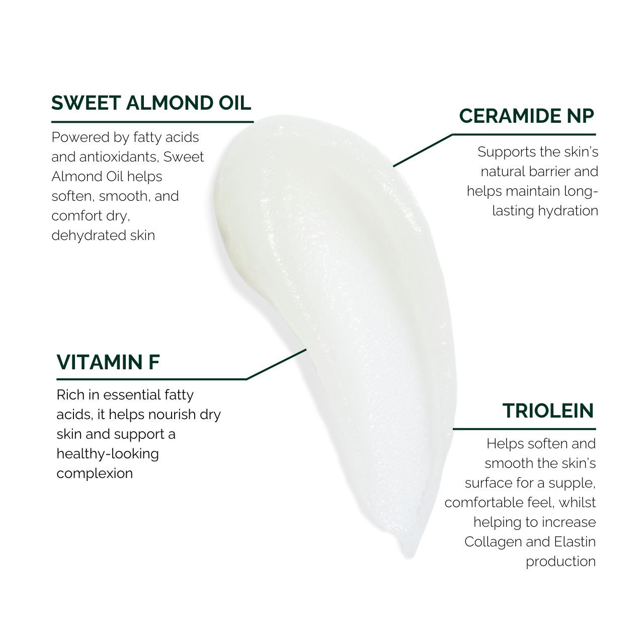 - Sweet Almond Oil - Powered by fatty acids and antioxidants, Sweet Almond Oil helps soften, smooth, and comfort dry, dehydrated skin