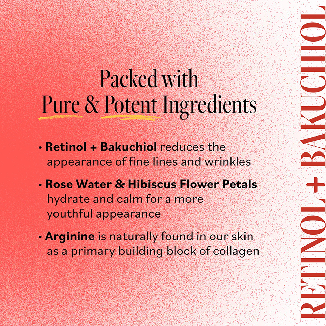 Yes the combination of Retinol and Bakuchiol promotes skin renewal and smooths texture, while Rose Water and Hibiscus Flower Petals provide calming hydration.