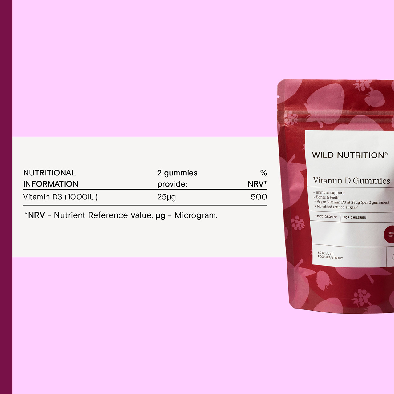 Wild Nutrition Children’s Food-Grown® Vitamin D Gummies are packed with the natural goodness of 13 whole fruits, providing high-strength vitamin D3 1000iu to support children’s immune systems, bones, muscles, and teeth. These Children's Vitamin D gummies are delicious forest fruits flavoured gummies for children, and offer a convenient and enjoyable way for kids to receive essential vitamin D3 for healthy growth and development.