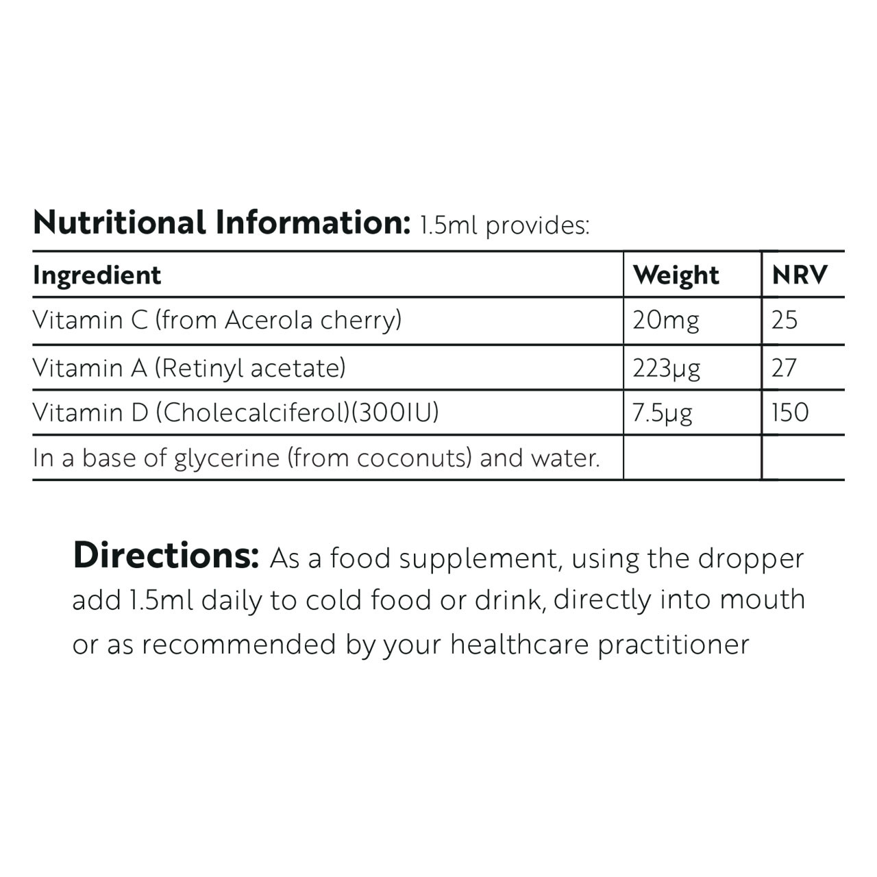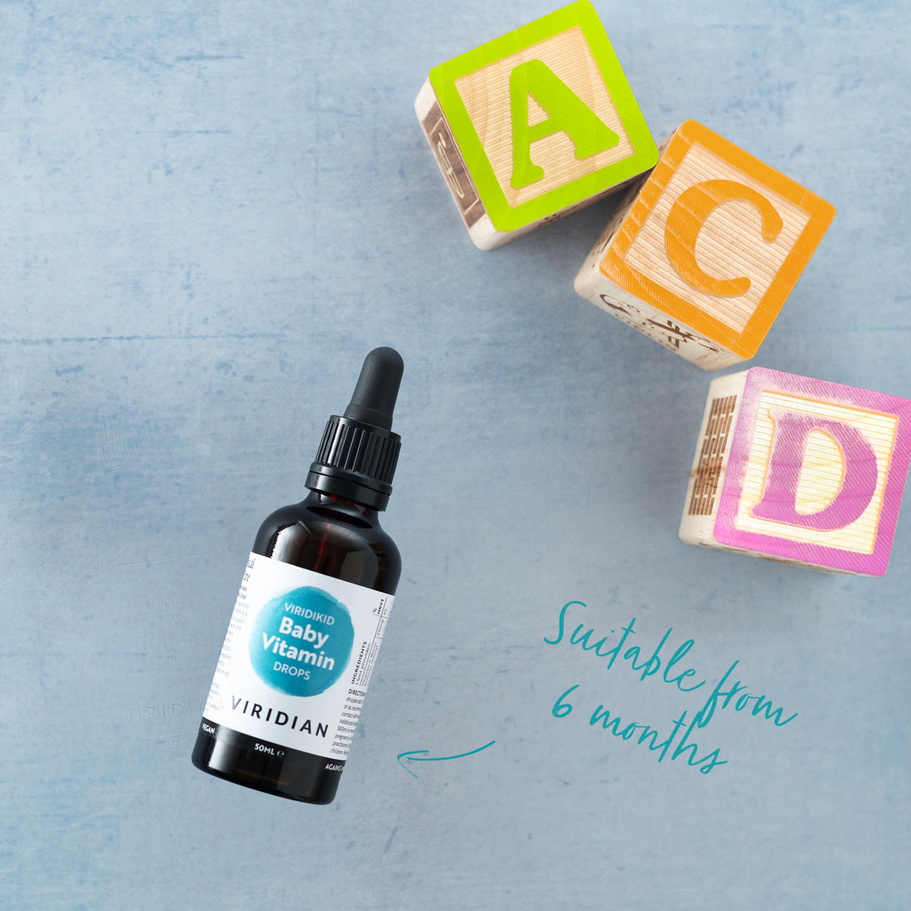 The government guidelines recommend that all children aged 6 months to 5 years are given vitamin supplements containing Vitamins A,C, and D daily. Viridian Baby Vitamin Drops contain l vitamins A, C and D to support immune health, bone development and iron absorption in babies from 6 months of age.