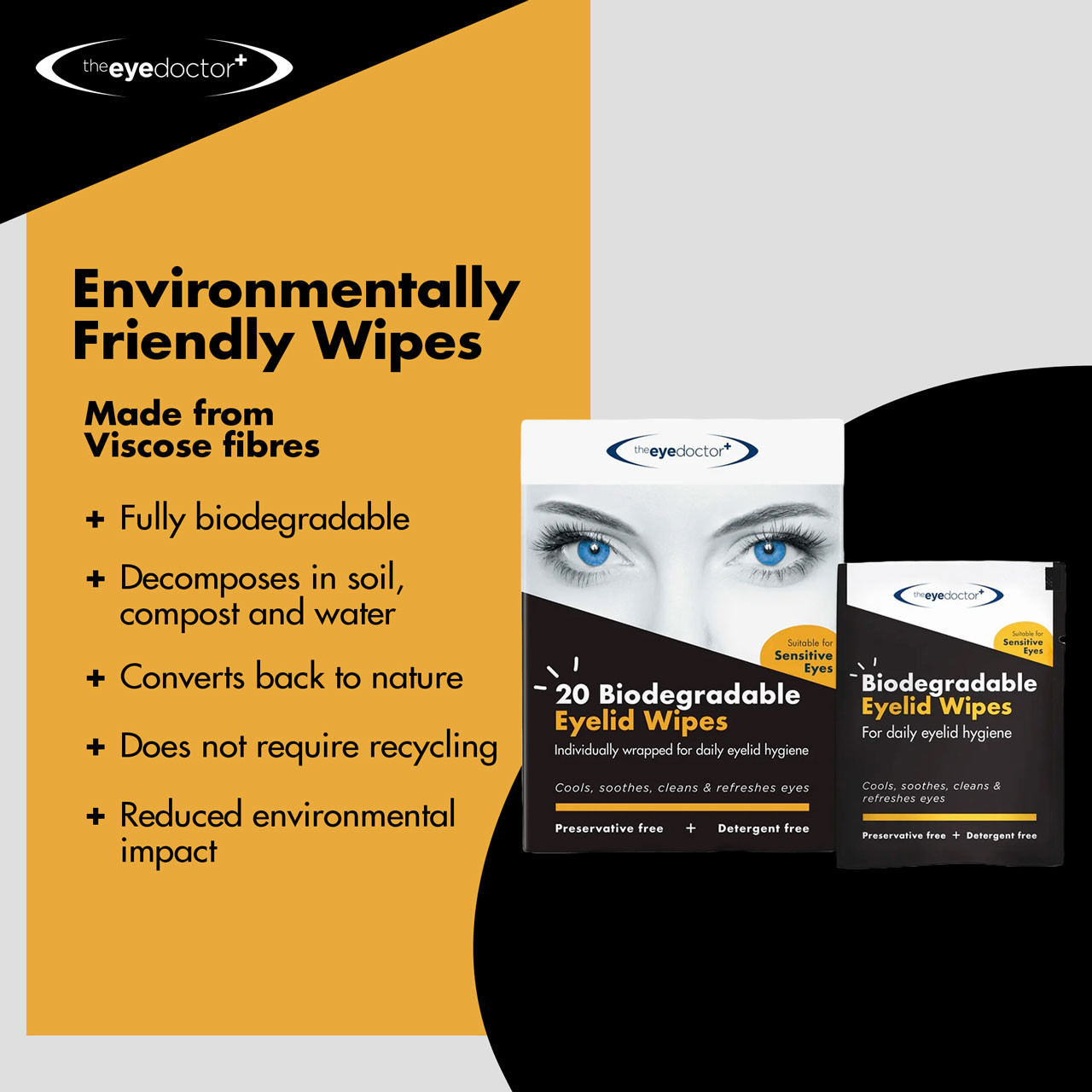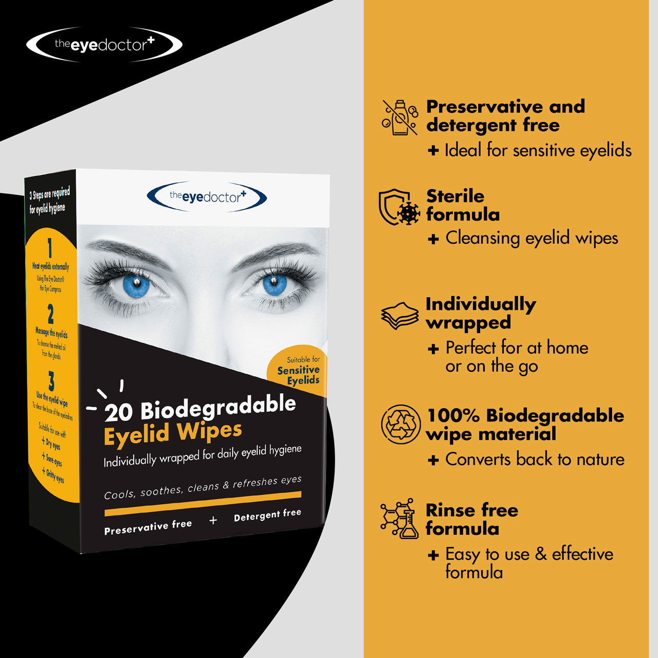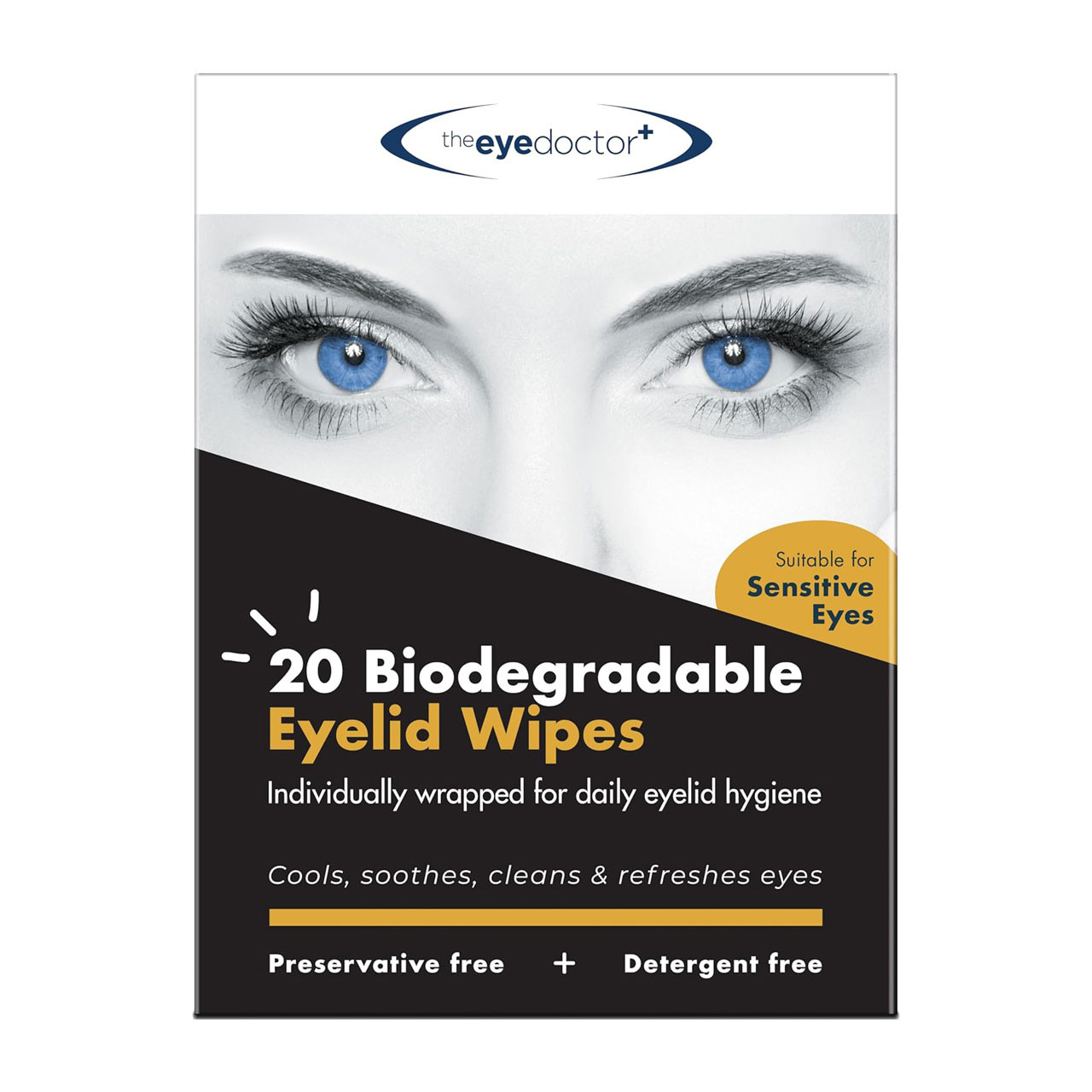 The Eye Doctor Biodegradable Eyelid Wipes.help to keep your eyelids clean and refreshed every day. These eyelid wipes are individually wrapped and each eye wipe is pre-soaked in a sterile, preservative-free saline solution helping to gently cleanse eyelids and eyelashes, leaving your eyes cool, comfortable, and refreshed. Perfect for daily use, these eye wipes for blepharitis provide a safe and effective eyelid hygiene, even for sensitive eyes.