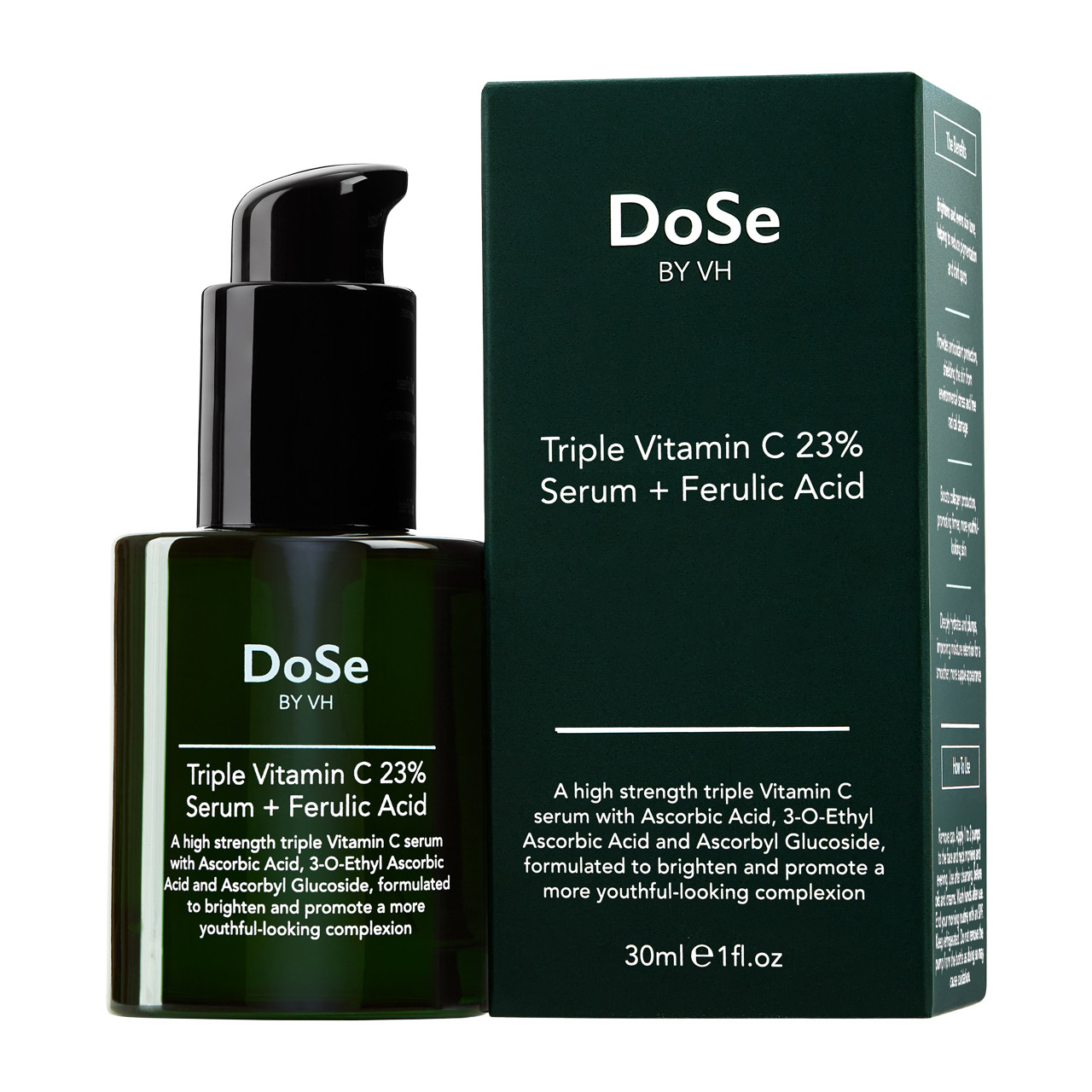 This Vitamin C + Ferulic Acid Serum is fast absorbing, non-sticky, high strength vitamin C serum for face helping to reduce the appearance of age spots and dark spots leaving skin with an even tone. DoSe Vitamin C serum contains three forms of Vitamin C: L-Ascorbic Acid, 3-O-Ethyl Ascorbic Acid and Ascorbyl Glucoside, that brighten, improve uneven skin tone, boost collagen production, and hydrate for a firmer, smoother, and more youthful-looking complexion. DoSe Triple Vitamin C serum is enhanced with Ferulic Acid, a powerful antioxidant that boosts the stability and effectiveness of Vitamin C, this brightening serum also provides superior protection against environmental stress to help protect against premature ageing.