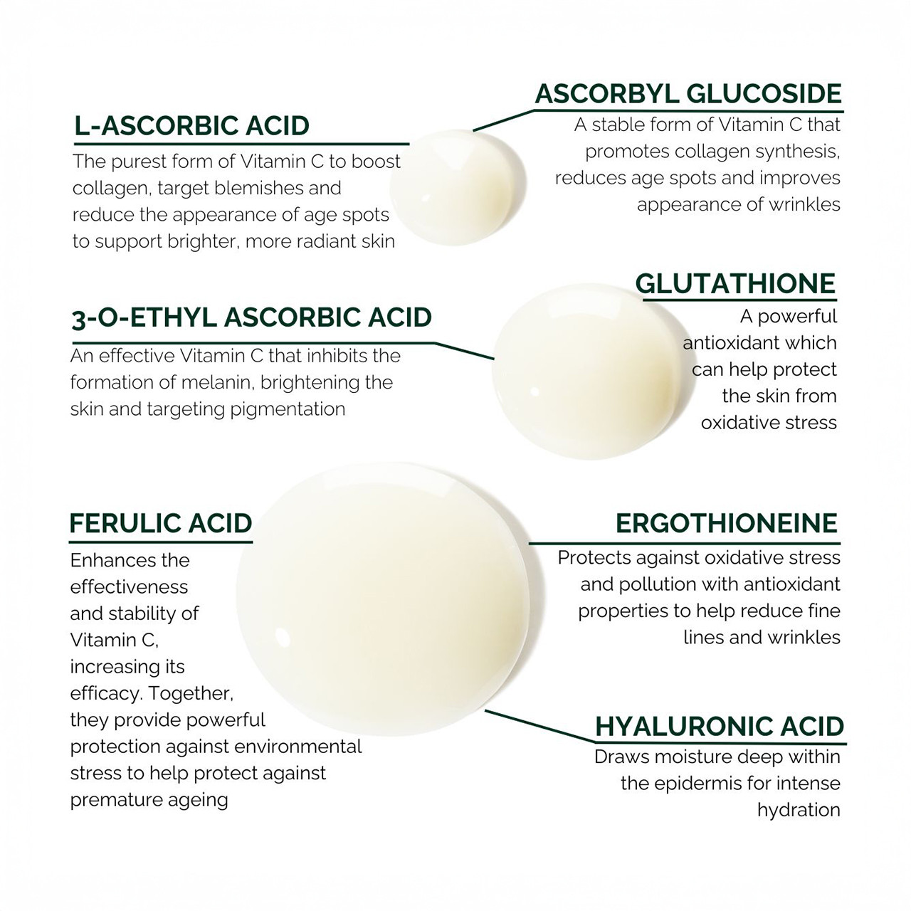 - Ferulic Acid - Enhances the effectiveness and stability of Vitamin C, increasing its efficacy. Together, they provide powerful protection against environmental stress to help protect against premature ageing